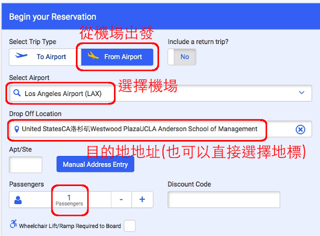 不論你人在哪裏,只要連上官網輸入上車地點和目的地(如LAX機場到UCLA),選擇車款,輸入航班資料,抵達時間,個人資料和多少行李,最後信用卡付費就完成了預定事宜。完成付款後會有一張預約單請印出隨身攜帶,因為上面有預約號碼,聯絡電話等資料,如果無法印出,也要記得把頁面拍下存在手機裡。